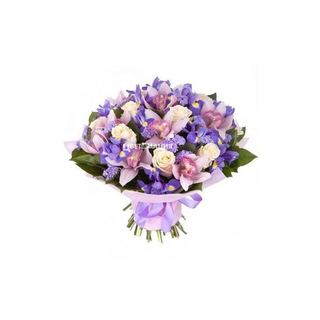 Ароматный букет из ирисов и роз, дополненный орхидеями