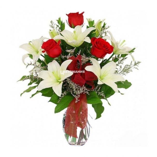Сочное сочетание лилий с розами в одном чудесном букете